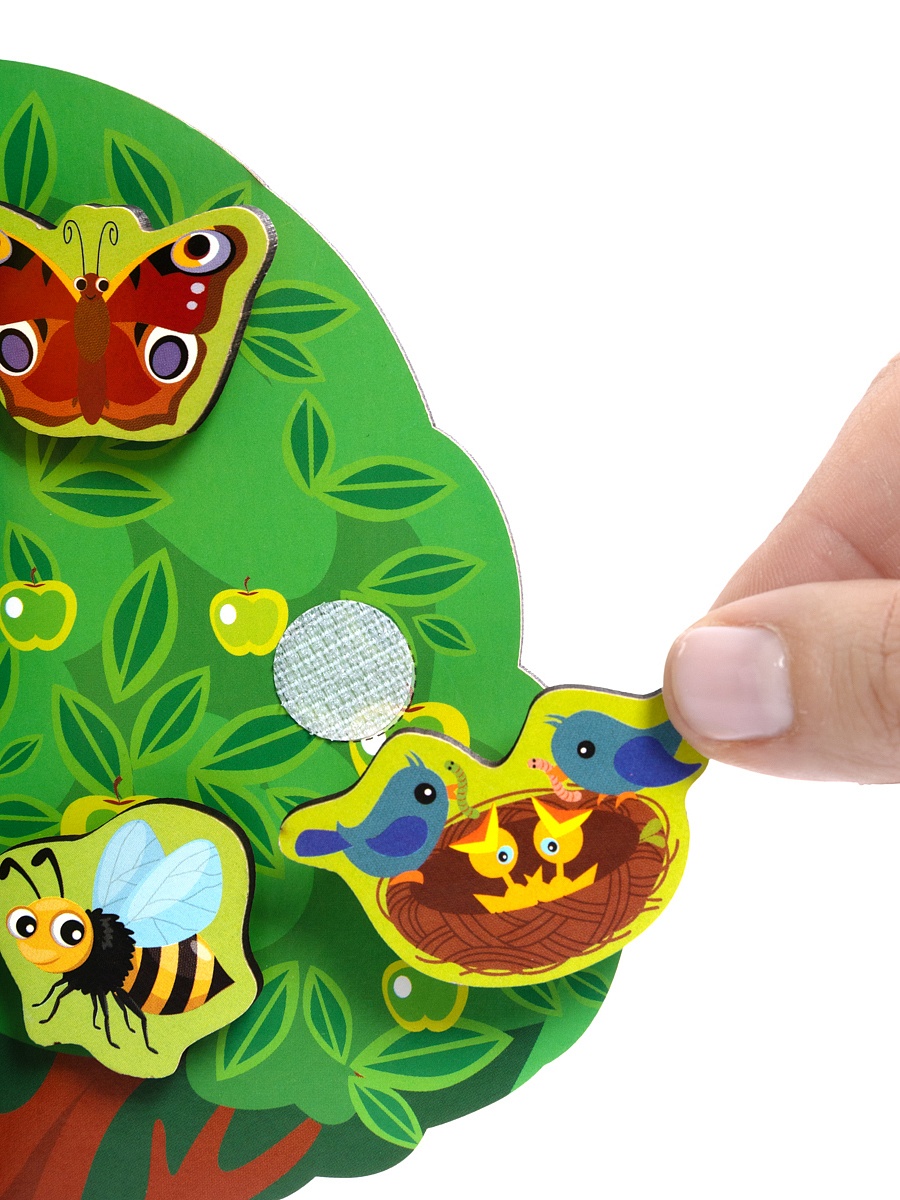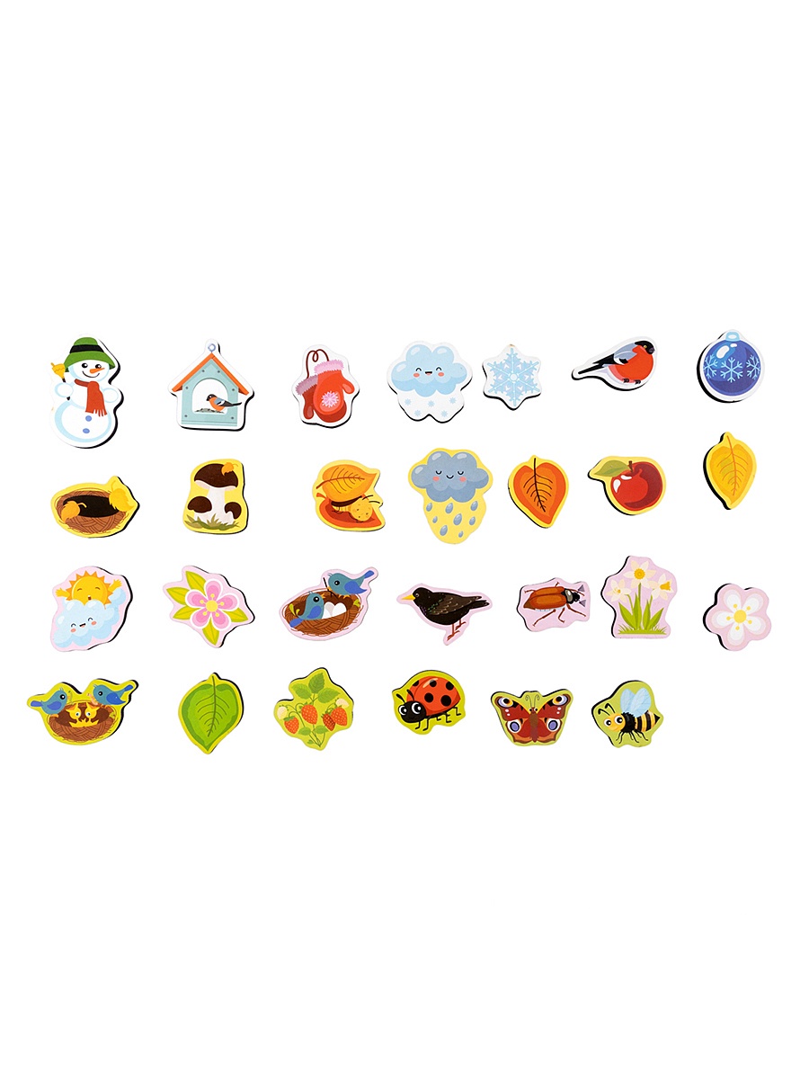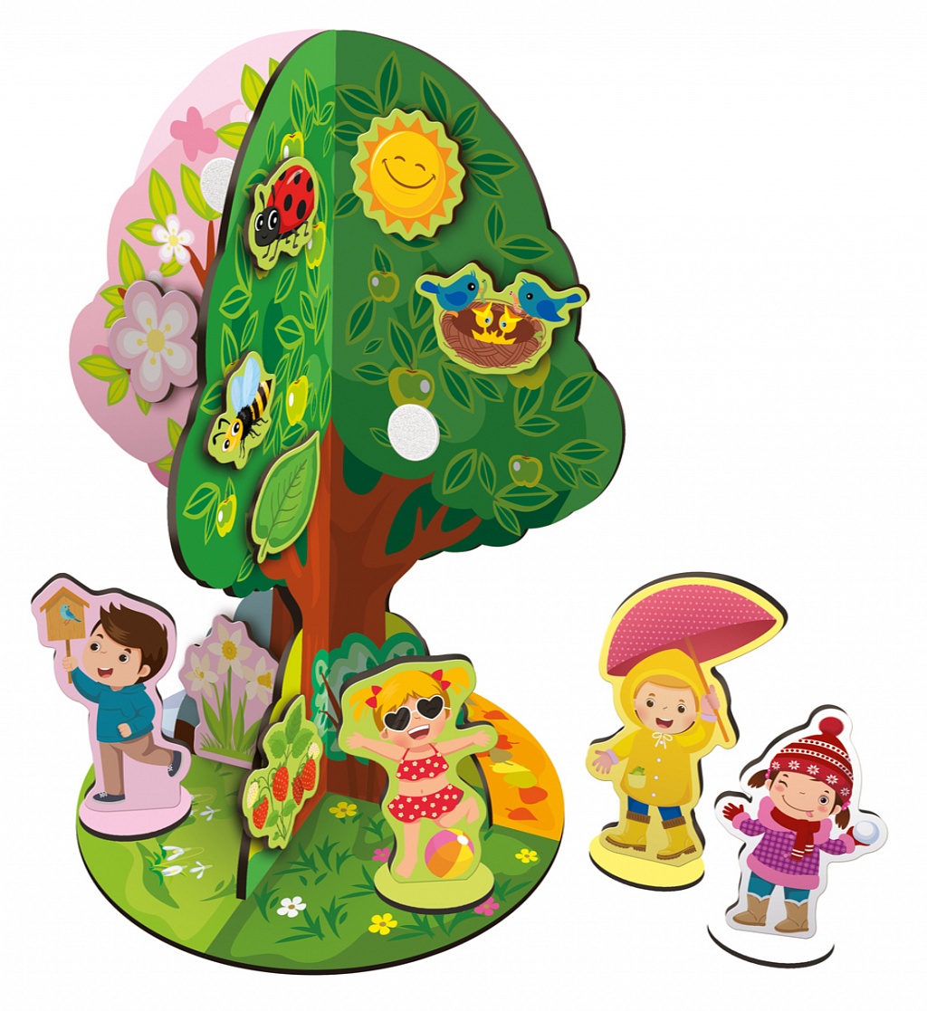 В комплект входят 28 красочных элементов, представляющих собой листву, цветы, плоды, снежинки и другие характерные атрибуты каждого времени года. С их помощью ребенок сможет самостоятельно «украшать» дерево, создавая реалистичные картины весны, лета, осени и зимы.