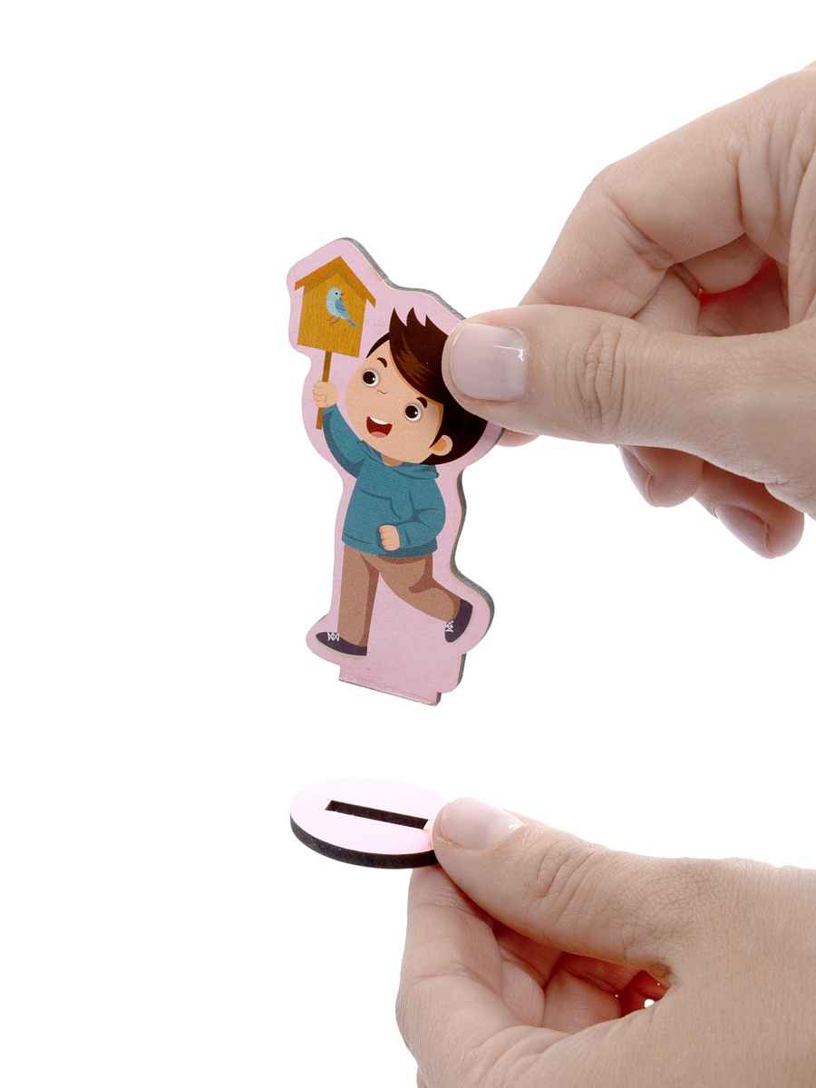 - Подставки для фигурок детей из древесного материала (2×3 см) — 4 шт.
