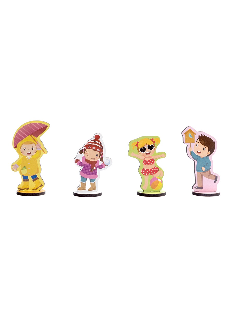 Четыре фигурки детей, одетых в соответствии с сезоном, помогут ребенку лучше понять, как меняется одежда и занятия людей в разное время года. Игра с фигурками стимулирует развитие воображения и творческого потенциала.